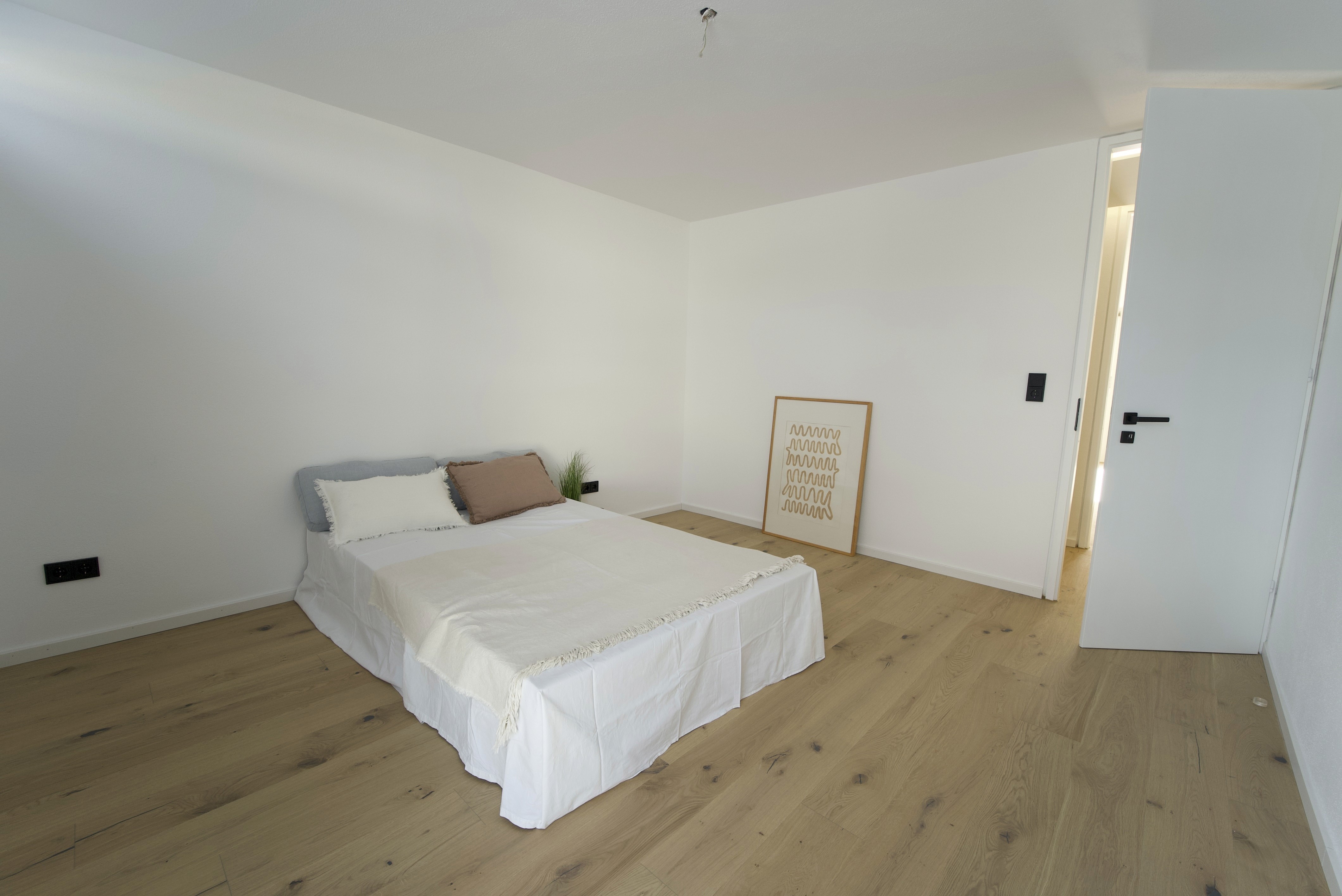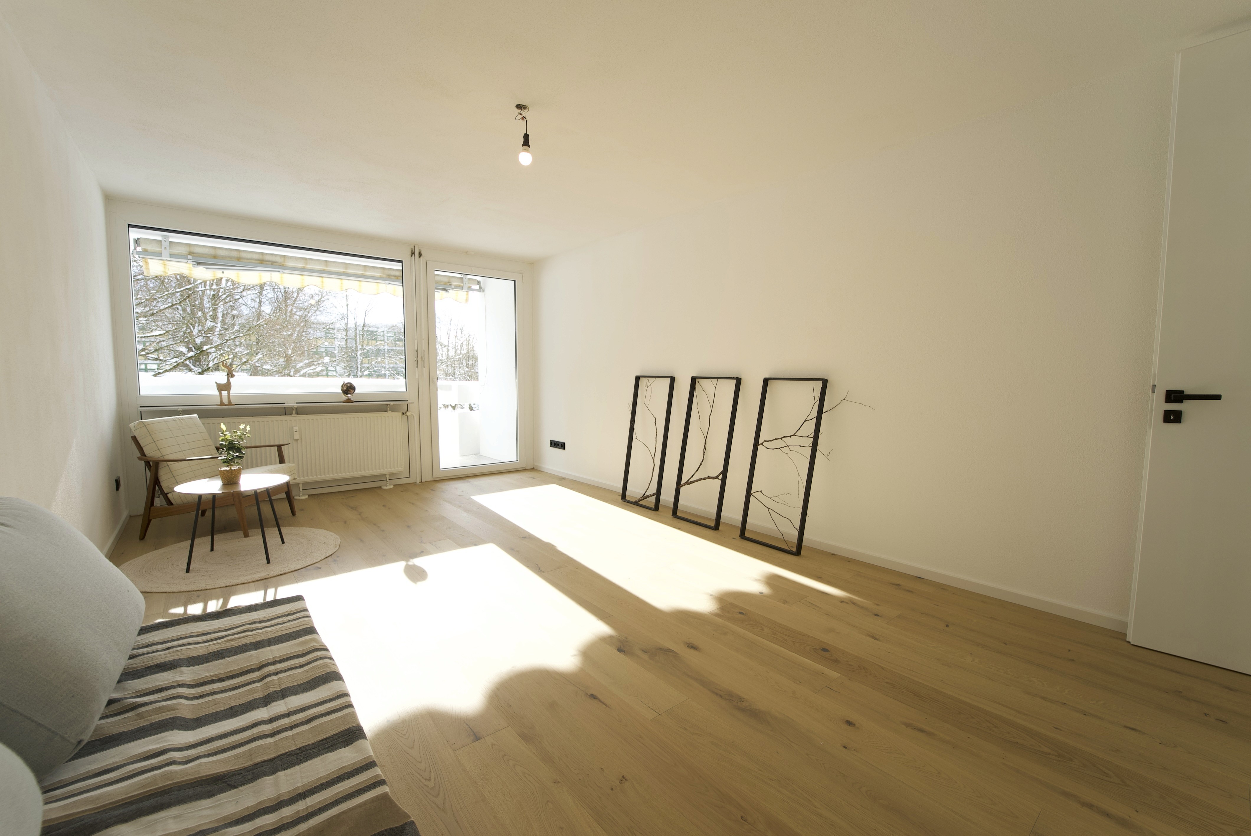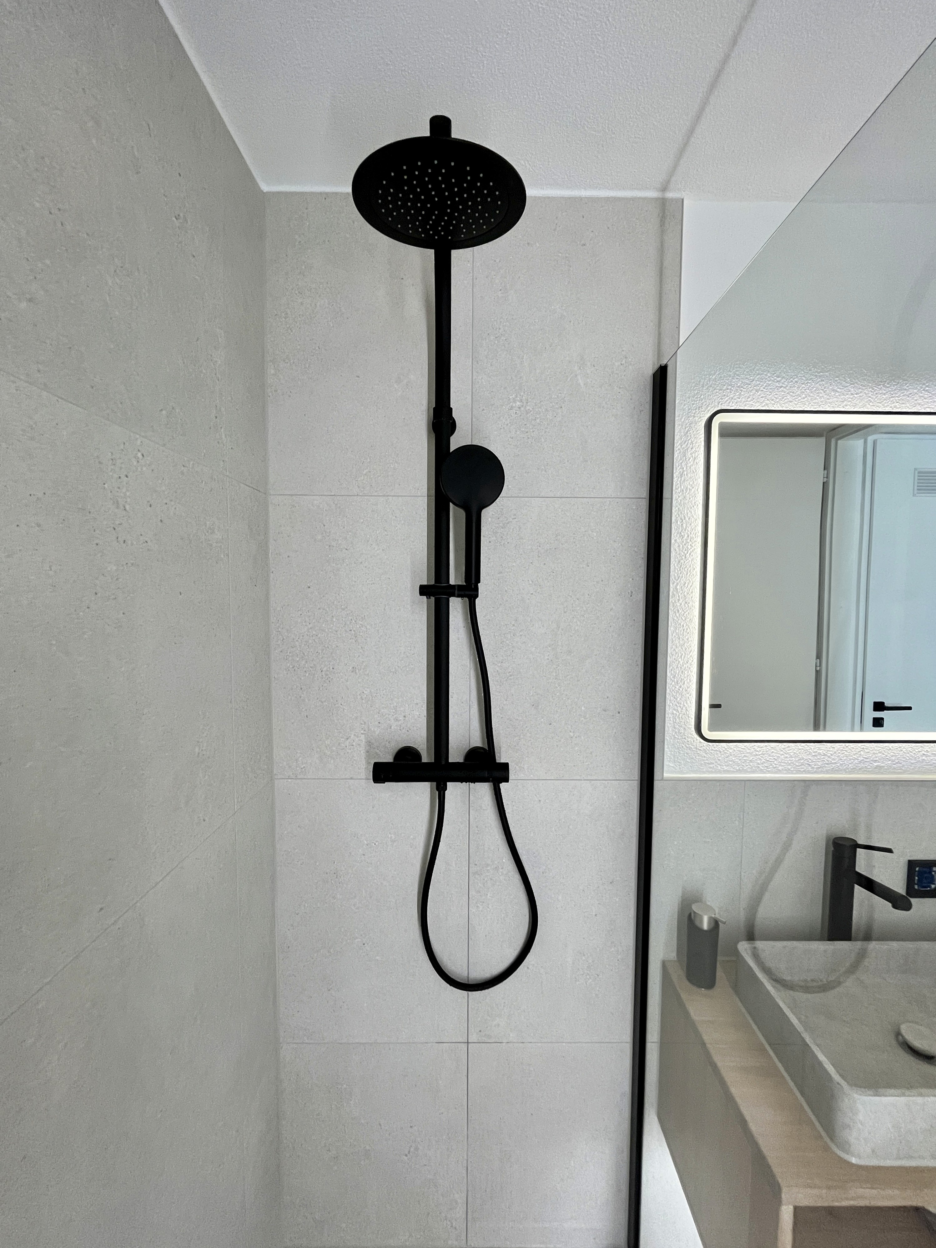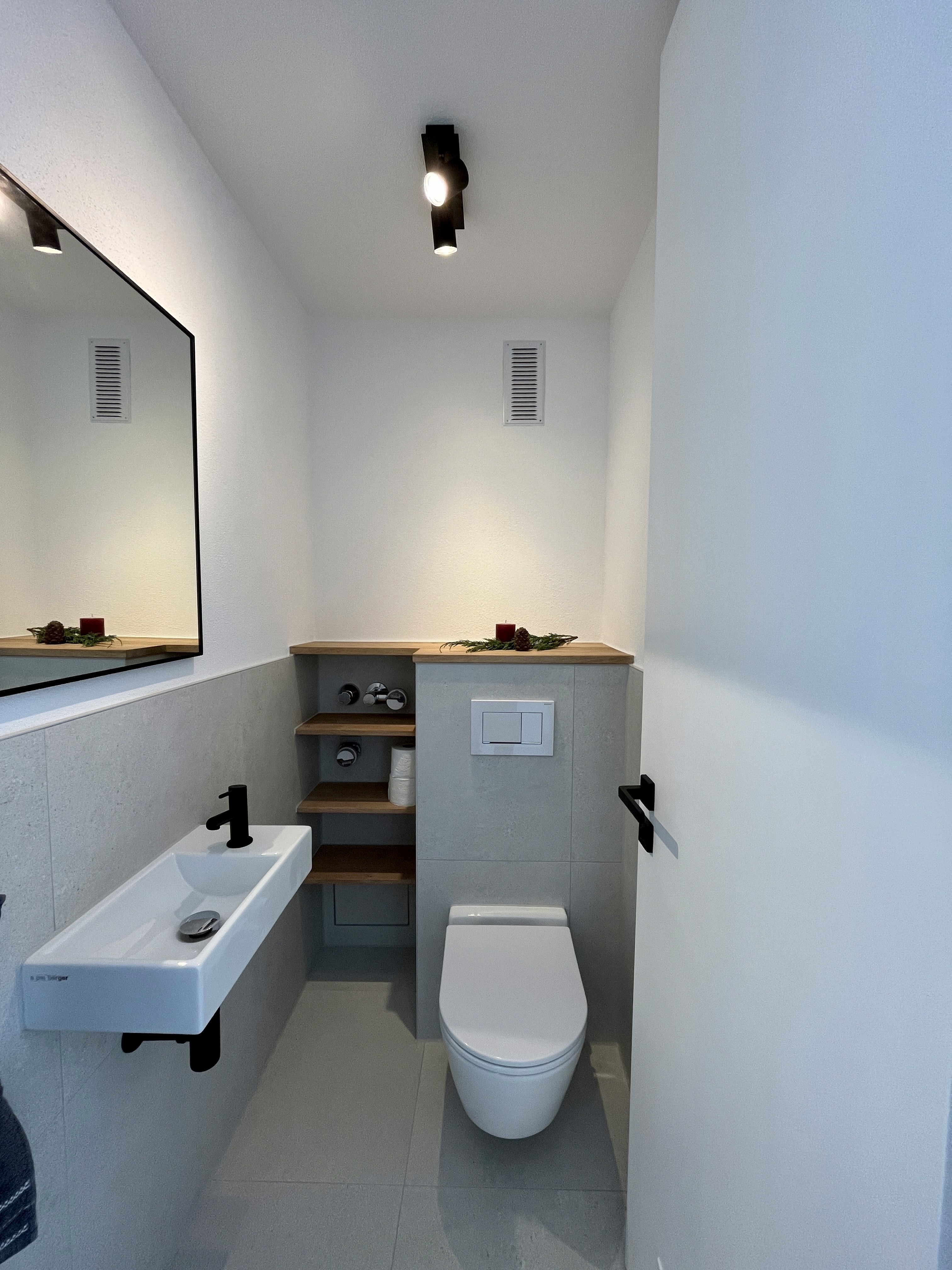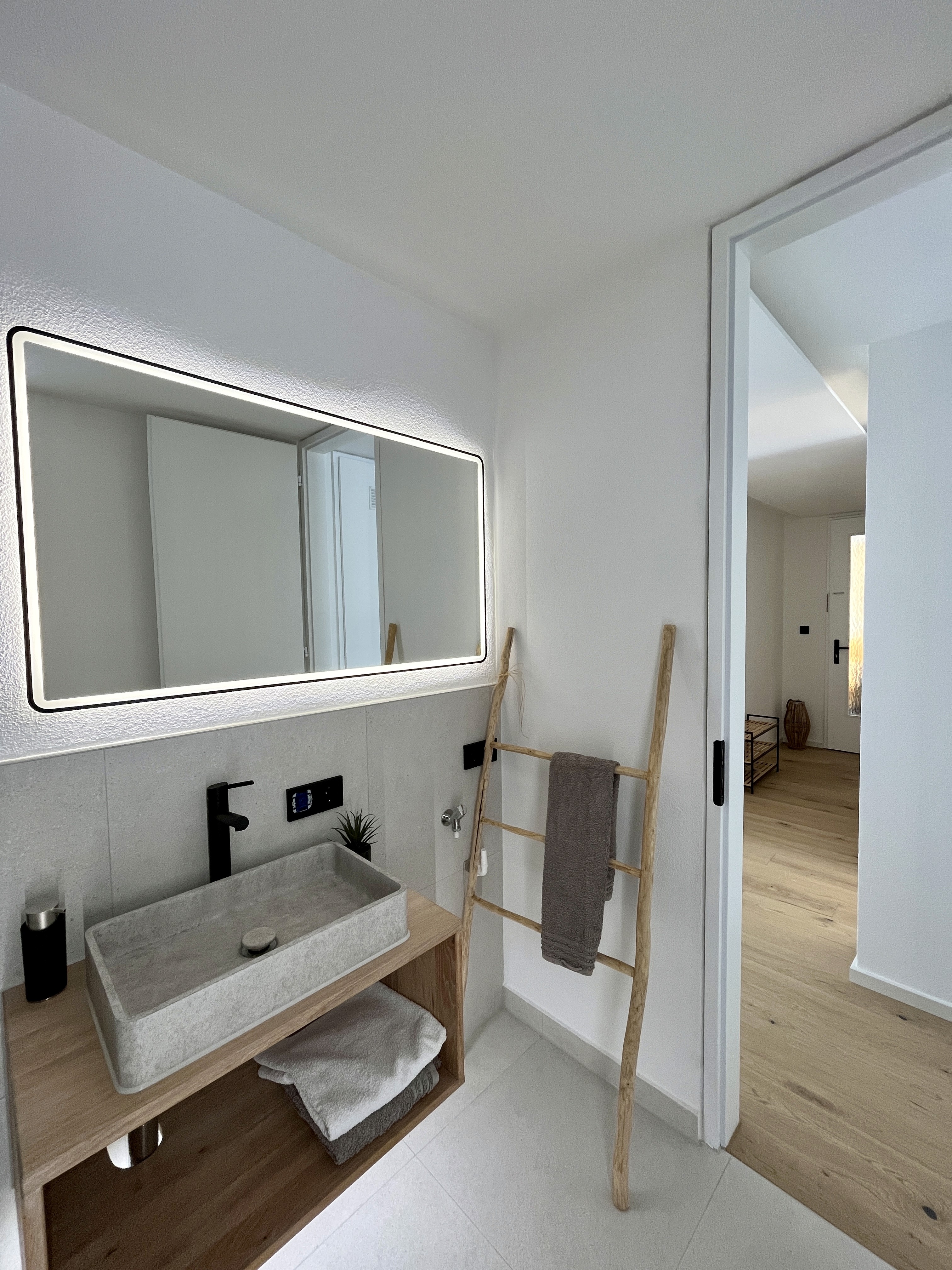 Diese Wohnung hat eine komplette Modernisierung erhalten und überzeugt jetzt mit einem zeitgemäßen Wohnkonzept. Besonders das Badezimmer sticht hervor: Schwarze Armaturen in Kombination mit einem eleganten Steinwaschbecken verleihen dem Raum eine edle, luxuriöse Note. Durch eine durchdachte Gestaltung und hochwertige Materialien wurde nicht nur die Optik verbessert, sondern auch der Wohnkomfort auf ein neues Level gehoben.