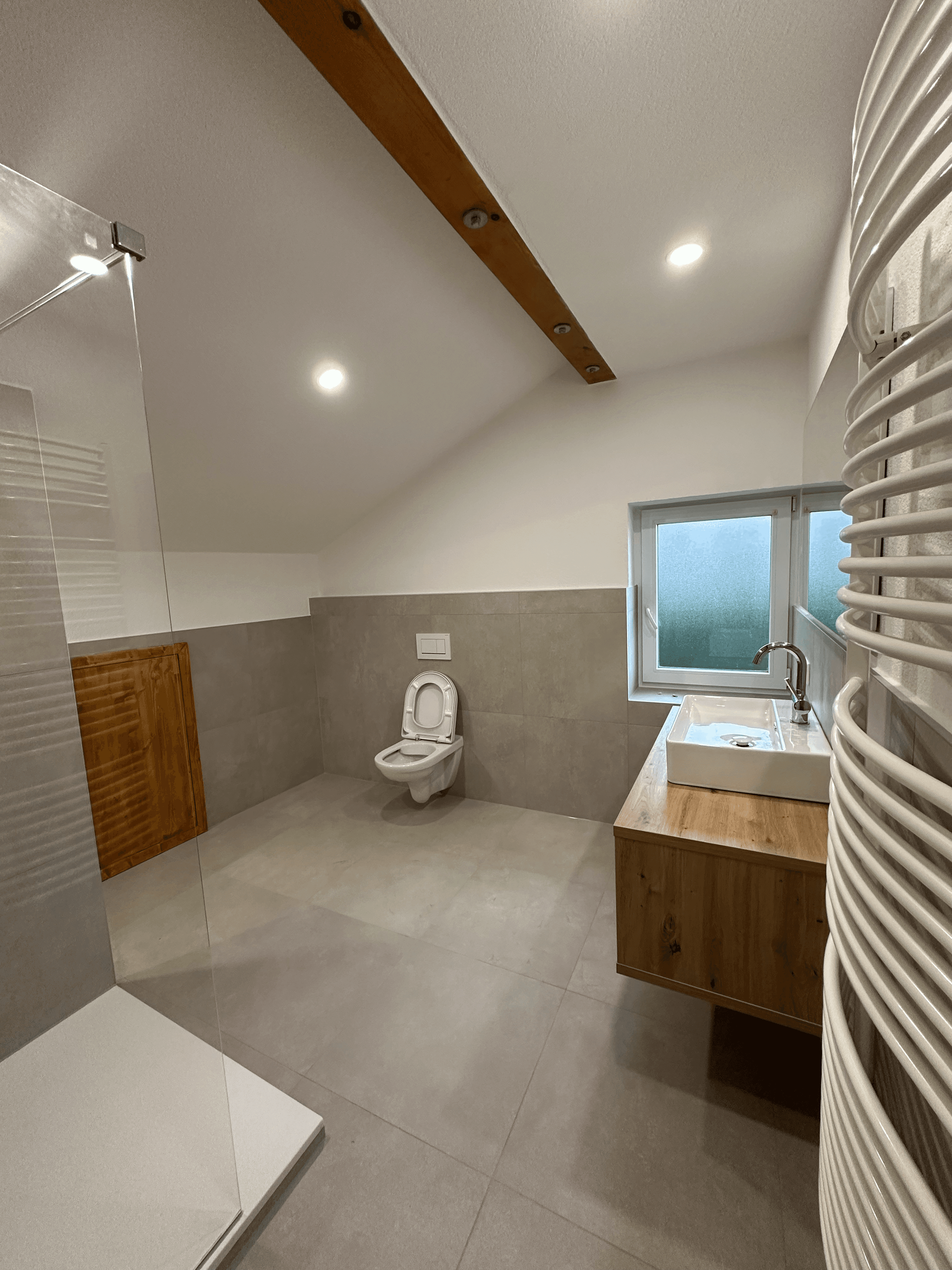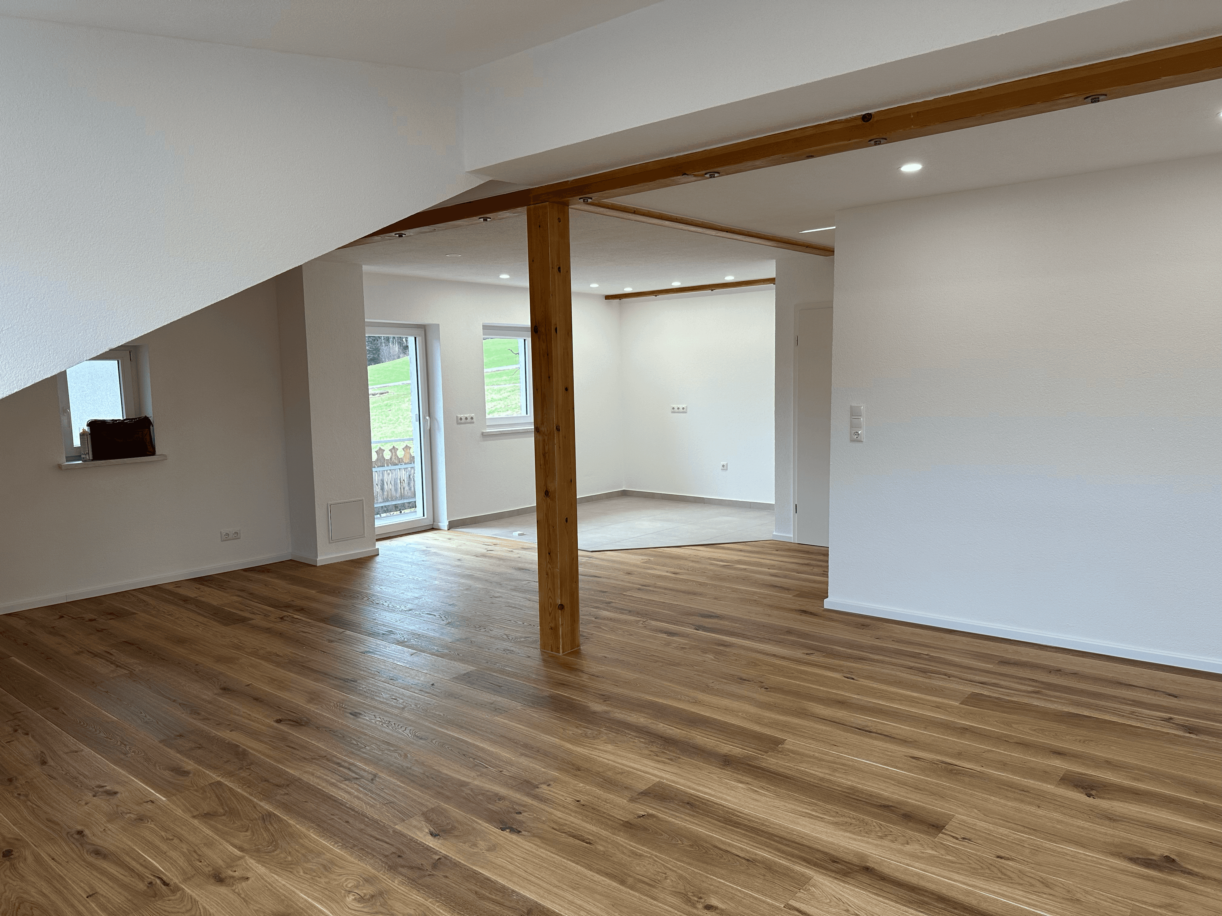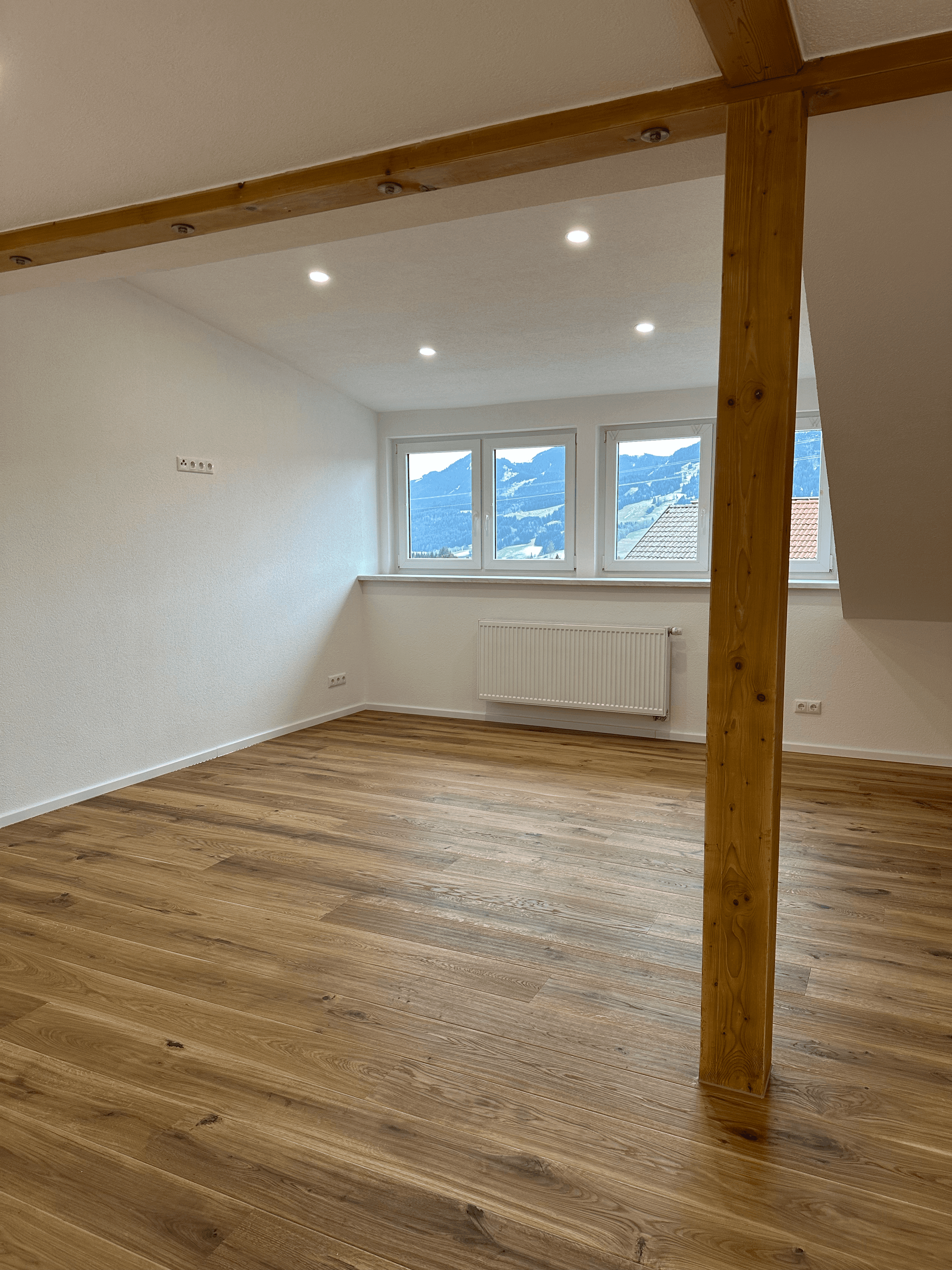 Dieses Dachgeschoss vereint rustikalen Charme mit modernem Wohnkomfort. Die freigelegten Holzbalken unterstreichen den gemütlichen Charakter der Räume, während eine optimierte Belichtung für ein helles und freundliches Ambiente sorgt. Neue Fenster eröffnen einen atemberaubenden Blick auf die umliegende Berglandschaft – ein echtes Highlight dieser stilvollen Renovierung.
